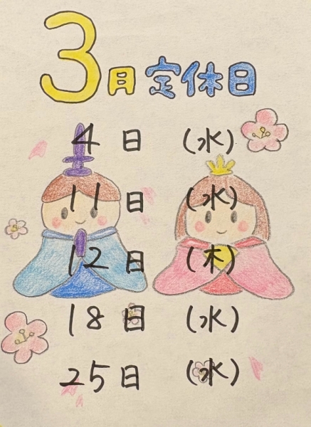 3月のお休みです!ご予約はこちらから!
